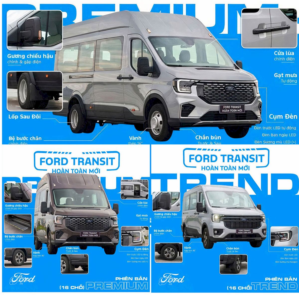 Ford Transit hoàn toàn mới gồm 3 phiên bản: Trend 16 chỗ, Premium 16 chỗ và Premium+ 18 chỗ với phong cách thiết kế hiện đại, tiện nghi, hữu dụng và được lắp ráp tại nhà máy Ford Hải Dương. Ngoài ra, Ford Việt Nam cũng cung cấp thêm hai phiên bản Transit Limousine 10 chỗ và 12 chỗ ngồi.